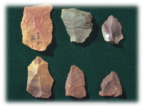 شکل. 1. منتخبی از ابزارآلات موستریانی (مربوط به انسآنهای نئاندرتال) از غار گروهام، گیبرالتر (جبل الطارق). اندازه کوچک و شیوه تراش مختص صنعت موستریانی، و ساخته نئاندرتال ها است. همچنین آنها از مواد خام گوناگونی تهیه شده اند، شامل سنگ چخماق (فلینت) و سنگ چخماق قرمز (ردچرت).